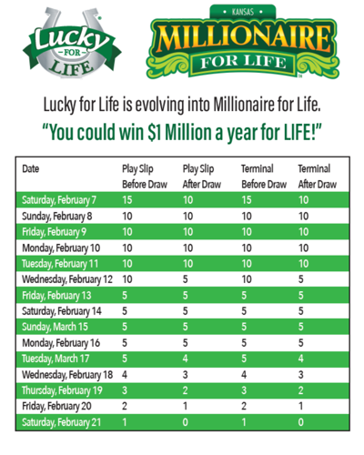 A new and exciting daily draw game is on the way to the Sunflower State. Millionaire for Life will have its first official drawing on Sunday, February 22. The game offers players a chance to win $1 Million a Year for LIFE every day of the week!